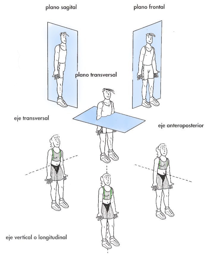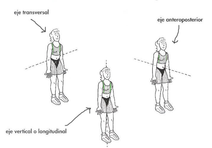 Cada uno de los tres planos del cuerpo tiene un eje asociado que pasa perpendicularmente a través del cuerpo. Todo movimiento se produce en un plano y alrededor de un eje.